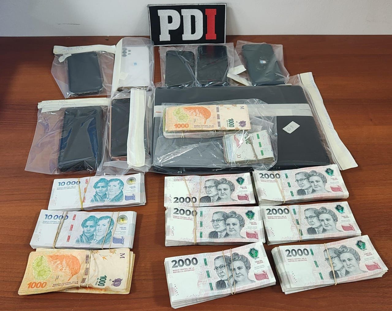 Con la colaboración de grupos de irrupción de la Policía de Santa Fe, efectivos de la PDI detuvieron a Manuel Alejandro R., Raúl Andrés J. y César Isaac G., en tanto que secuestraron 40 teléfonos celulares, 1 notebook, 1 DVR, dinero en efectivo por 4.095.700 pesos y 5250 dólares, 2 pistolas calibre 9 milímetros con la numeración suprimida, 1 motocicleta de 150 cc, 2041 dosis de cocaína, 1 trozo compacto de cocaína por un pesaje total de 1060 gramos.