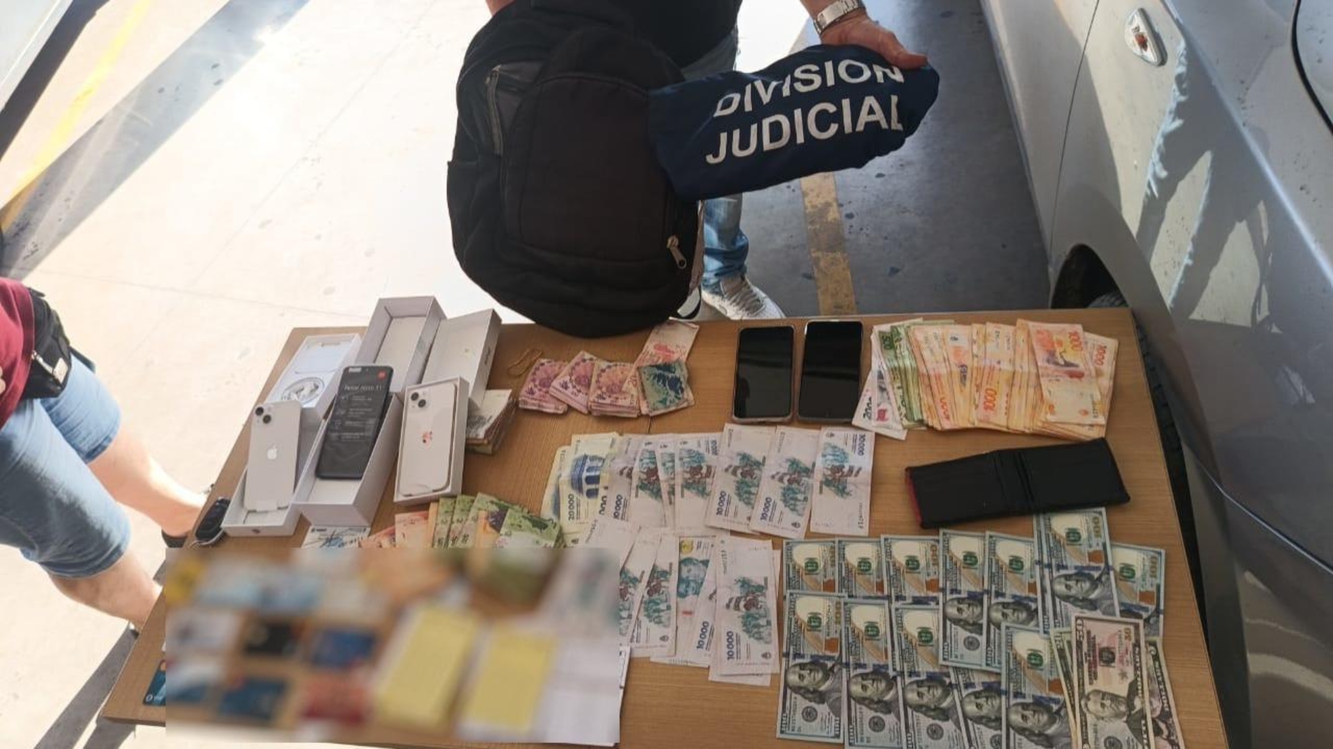 Una vez aprehendido, se solicitó al fiscal Rébola que solicite autorización para allanar otro domicilio, en este caso en calle Gorriti al 5700, donde se domiciliaría uno de los sospechosos. Allí se procedió al secuestro de 62.197.800 de pesos argentinos, 229.000 pesos chilenos, y 3.485.000 pesos colombianos, como también una carabina calibre 22 reformada, un revolver calibre 32, un auto Ford Focus, 24 teléfonos celulares, una máquina de contar billetes, electrodomésticos y demás dispositivos electrónicos.