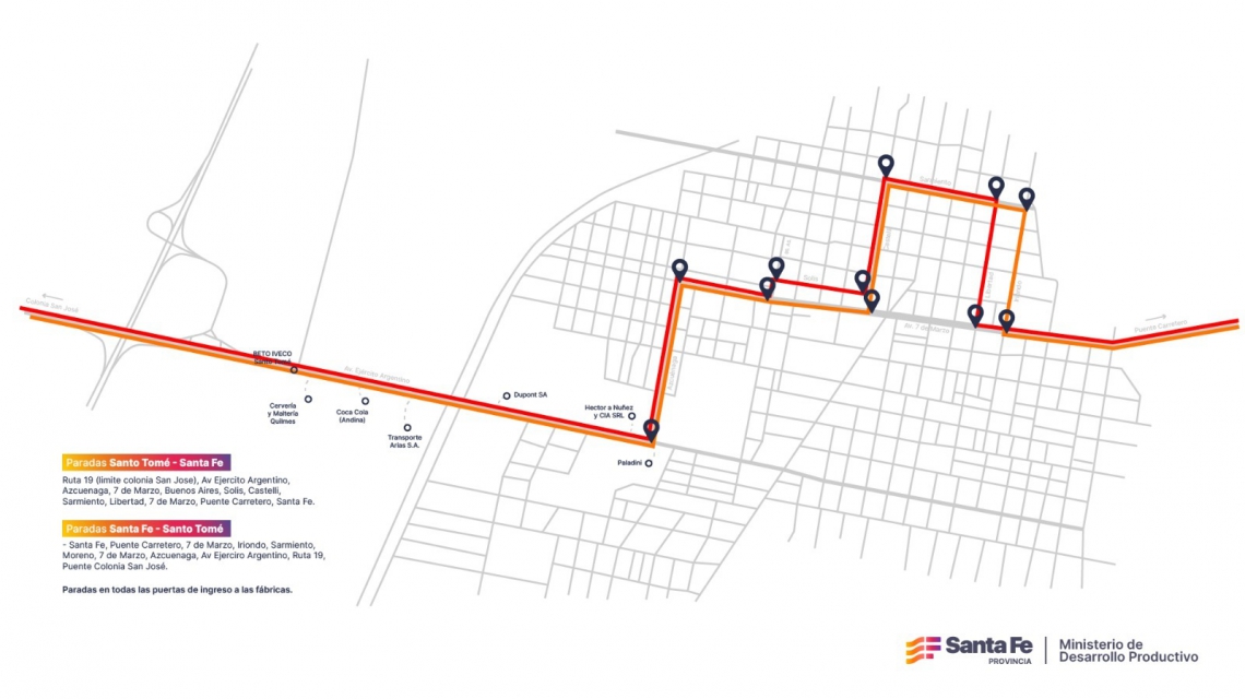 En el sentido Santa Fe hacia Santo Tomé, las paradas se extienden por Calle Azcuénaga, Ejército Argentino y Ruta 19, e incluyen puntos clave como Núñez Calsa, Dupont, Estados Unidos, Paladini, Iveco y otras industrias radicadas a lo largo del trayecto.
