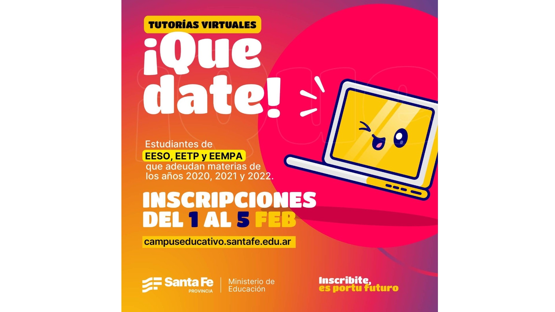Desde el sábado 1° de febrero hasta el miércoles 5 estará abierta la inscripción al programa “Quedate”, una iniciativa del Gobierno Provincial para que los jóvenes puedan terminar el secundario. Los interesados deberán inscribirse en la modalidad virtual en https://campuseducativo.santafe.edu.ar/ , ingresando al botón “Quedate” y registrándose con su ID ciudadana.