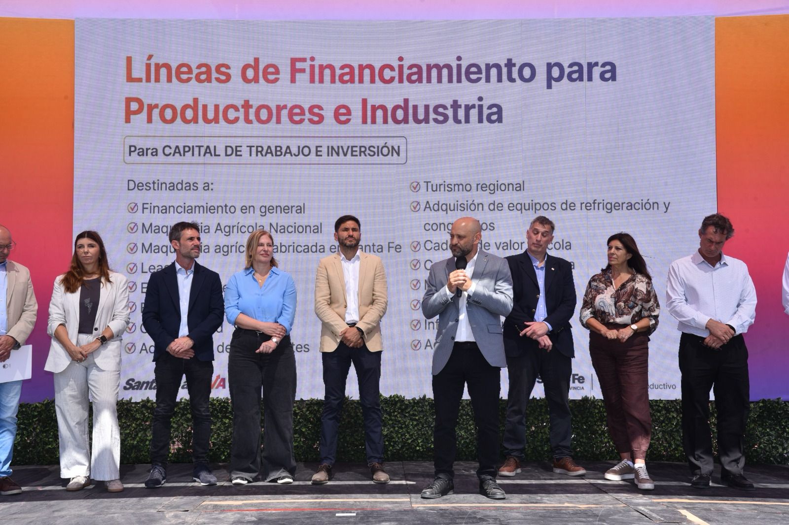El gobernador Maximiliano Pullaro y los ministros de Desarrollo Productivo, Gustavo Puccini, y de Economía, Pablo Olivares, presentaron este martes en Expoagro cupos de financiamiento por más de 145.000 millones de pesos para activar la producción santafesina.