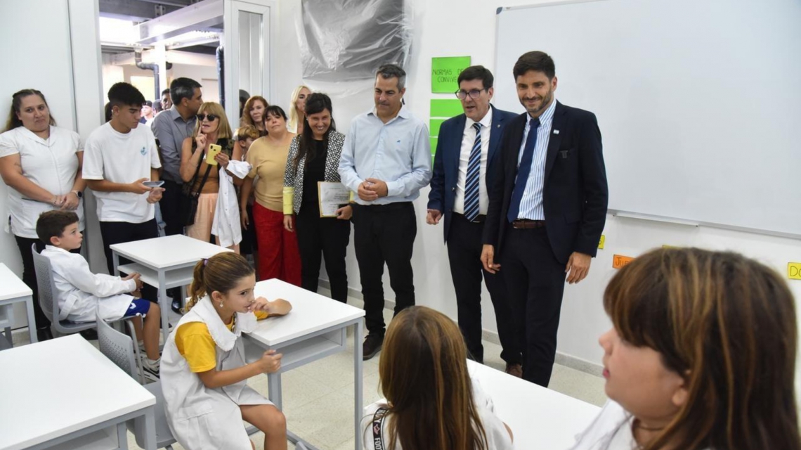 El Gobierno Provincial inauguró la nueva escuela Primaria Nº 1409 de la ciudad de Pueblo Esther. El gobernador Maximiliano Pullaro encabezó el acto el martes por la tarde, junto al ministro de Educación, José Goity.