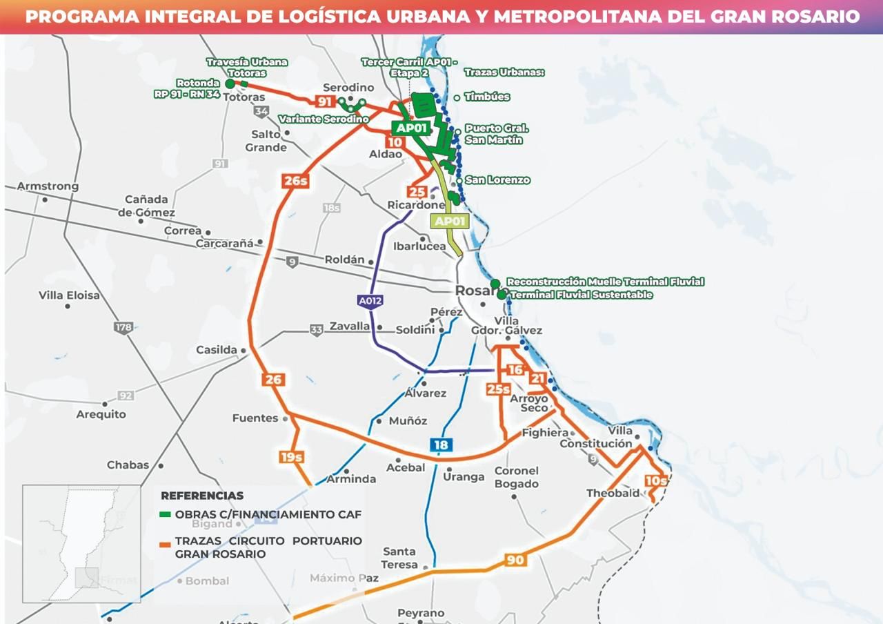 El programa integral de logística urbana y metropolitana apunta a fortalecer la integración del Gran Rosario con su complejo portuario, impulsándolo como nodo estratégico del desarrollo productivo mediante un ambicioso programa de obras de infraestructura logística.