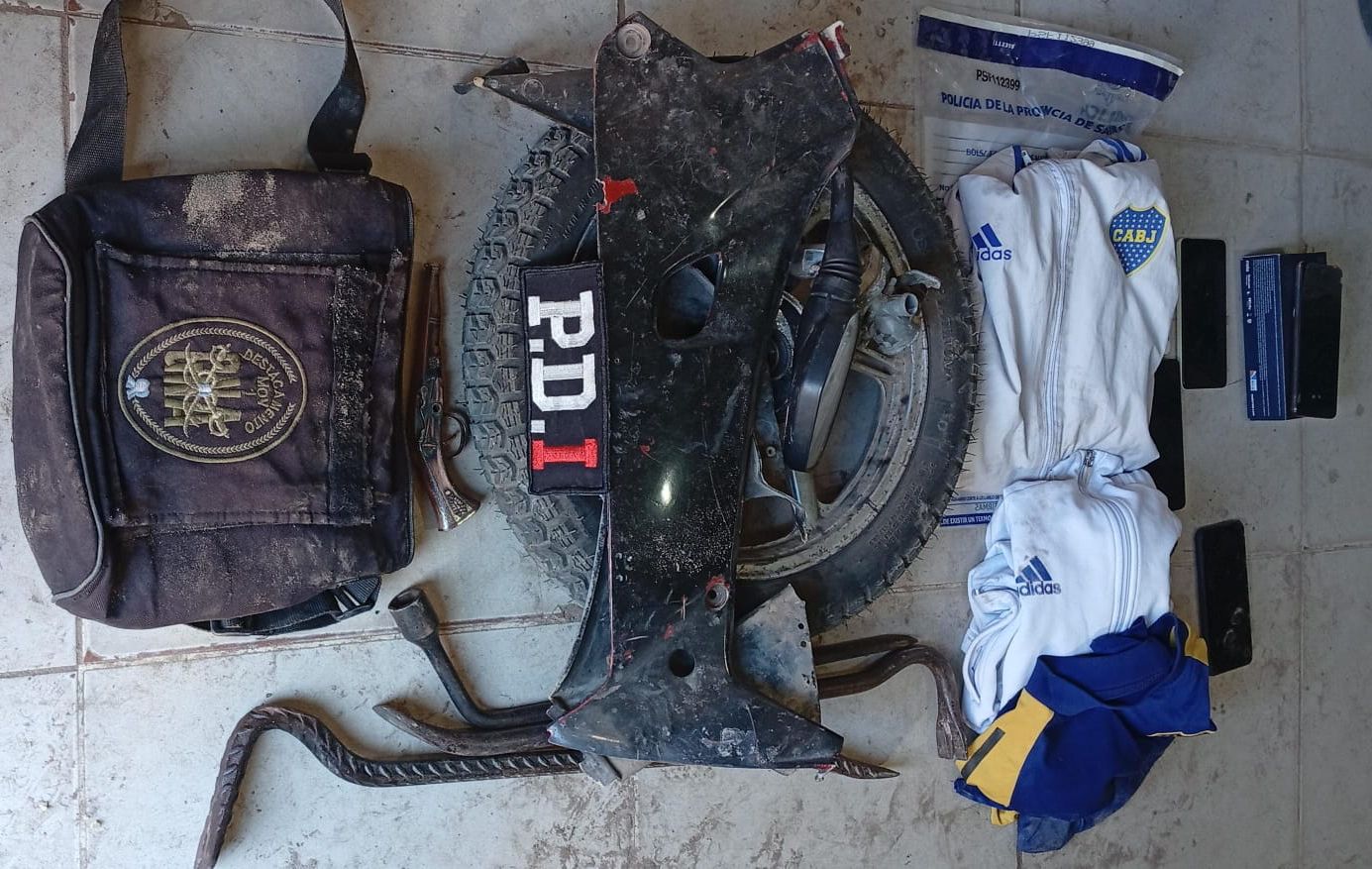En un domicilio ubicado en Azcuénaga y Alberdi, los investigadores incautaron una culata de madera, una chapa patente, una óptica y un espejo de motocicleta, y detuvieron a G M, acusado de encubrimiento.