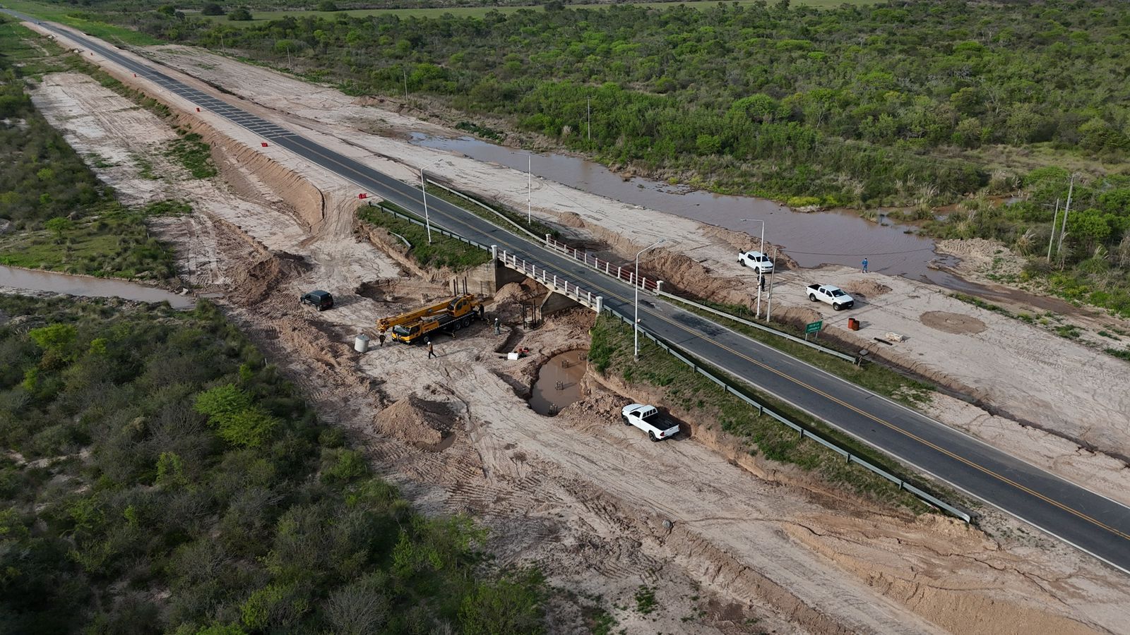“A los 13,3 metros de ancho entre calzada y banquinas hay que agregarle la defensa metálica, dando un ancho total de unos 14,6 metros, más que el doble del ancho actual. Después de haber hecho los terraplenes temporales para controlar el caudal de los arroyos, empezamos a trabajar en las estructuras del nuevo puente, agregando pilotes de hormigón paralelos a la estructura actual para así poder hacer el ensanchamiento del tablero”, amplió Seghezzo.